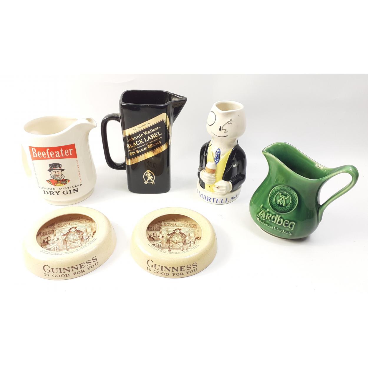 A super bar advertising lot to include ARDBEG, JOHNNIE WALKER BLACK LABEL, BEEFEATER GIN, MARTELL brandy water jugs and 2 vintage ceramic GUINNESS ashtrays