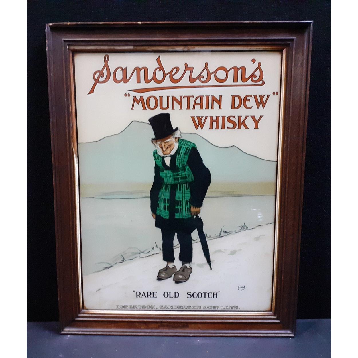 A hard to find SANDERSON'S "MOUNTAIN DEW" WHISKY 'Rare Old Scotch' Robertson, Sanderson & Co Ltd, Leith' advertising picture on glass c1890s. Some damage to the wooden frame which is stamped Sanderson's. Glass is intact frame 60x48cm approx