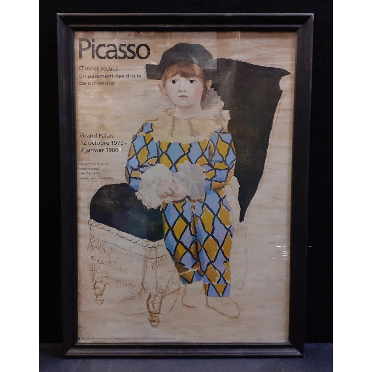A PICASSO exhibition advertising print advertising an exhibition at the Grand Palais 1979-1980 depicts Paul en Arlequin 1924. Frame size 65x47cm approx