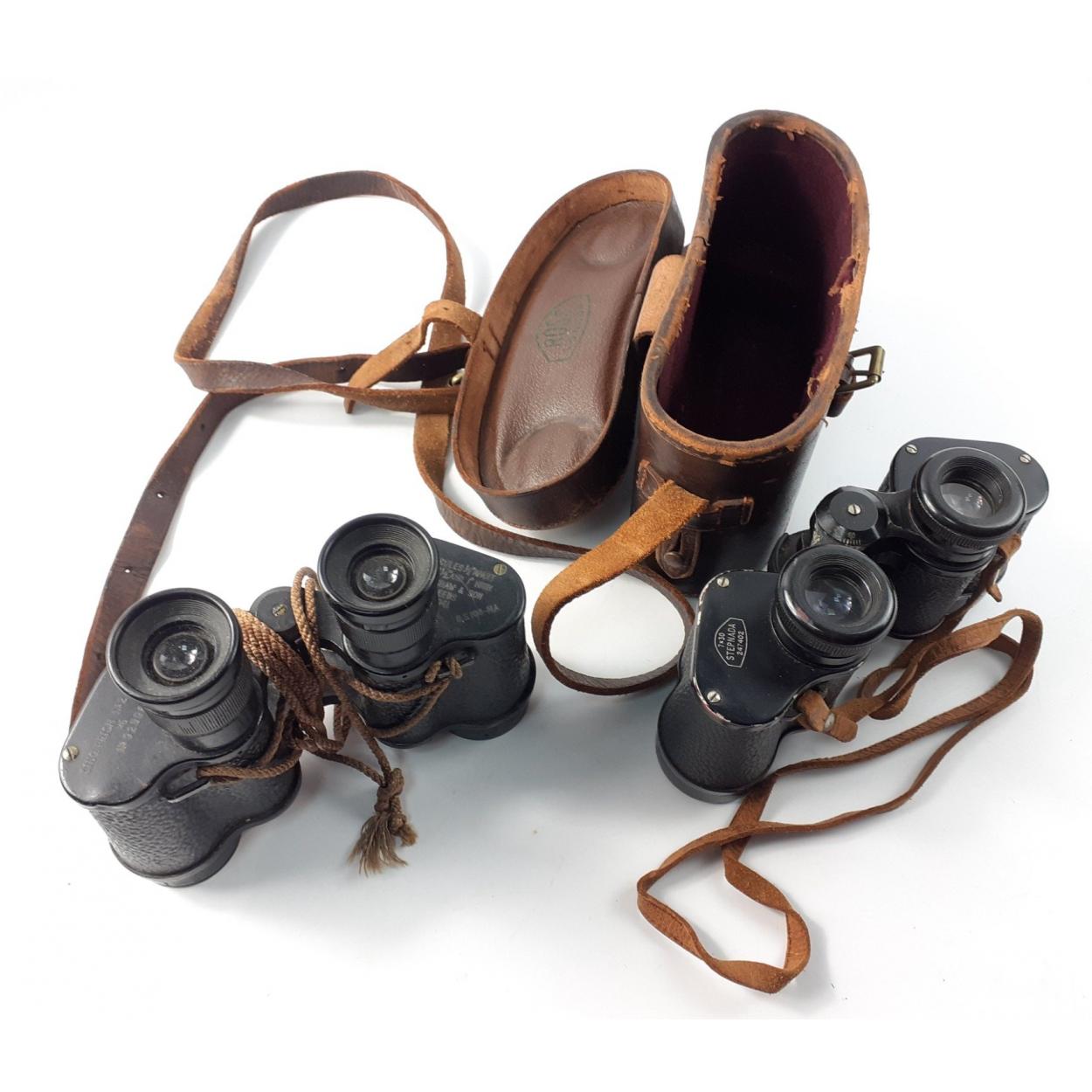 Two pairs of vintage binoculars to include ROSS 7 X 30 STEPANADA in leather case and AKERSHAW & SONS OF LEEDS 1941 dated Binoprism NO. 2 NK2 x 6. All optically clear.