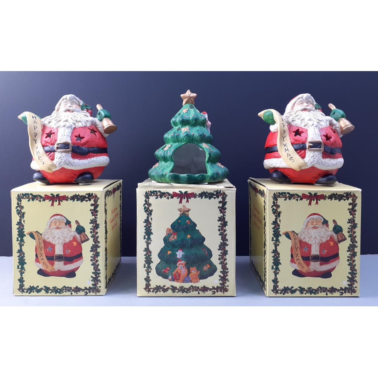 Three boxed Christmas candle holders - two Santas and one Christmas tree each 13cm approx