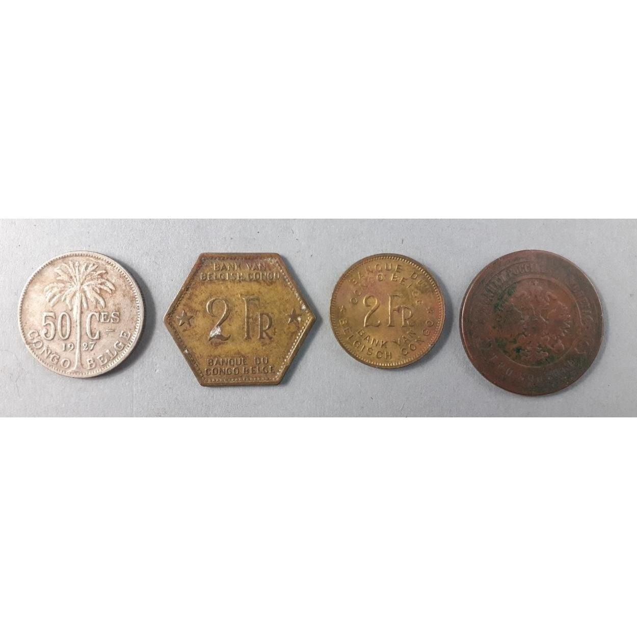 Coins of interest to include a 1899 Russian 3 kopek, and 3 coins of the Belgian Congo
