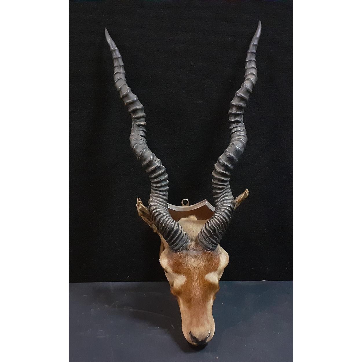 A taxidermy Indian black buck head mounted on a plinth. Horns measure approx 54cm long. Some slight damage to the muzzle.