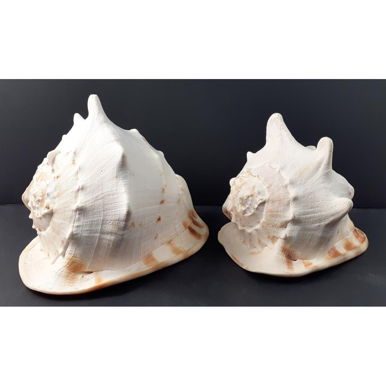 Two beautiful large conch shells 29cm and 25cm. Beautifully patterned and in excellent condition