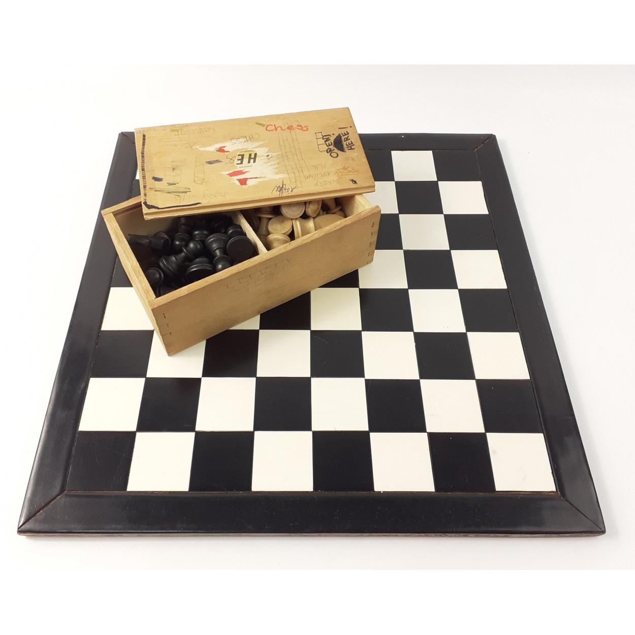 A large chess board (46x46cm approx) with stone pieces in the style of the Lewis Chessmen, missing 2 pieces