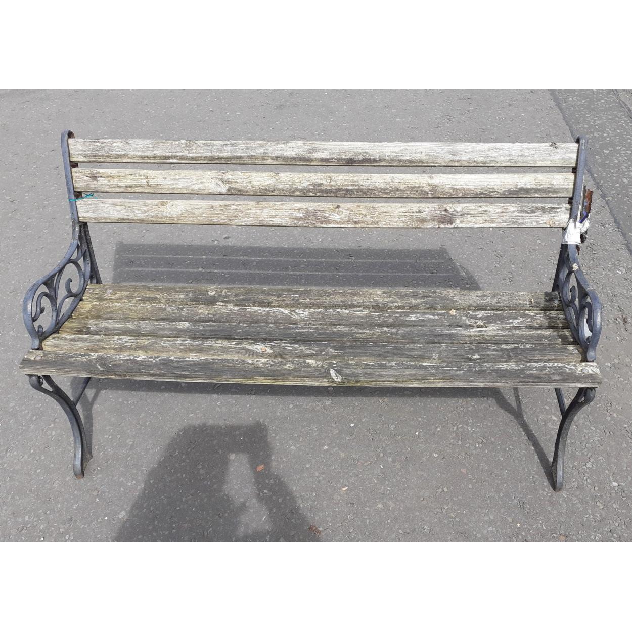 A 2 seater garden bench with cast iron ends . Has wear L137 x H75cm approx
