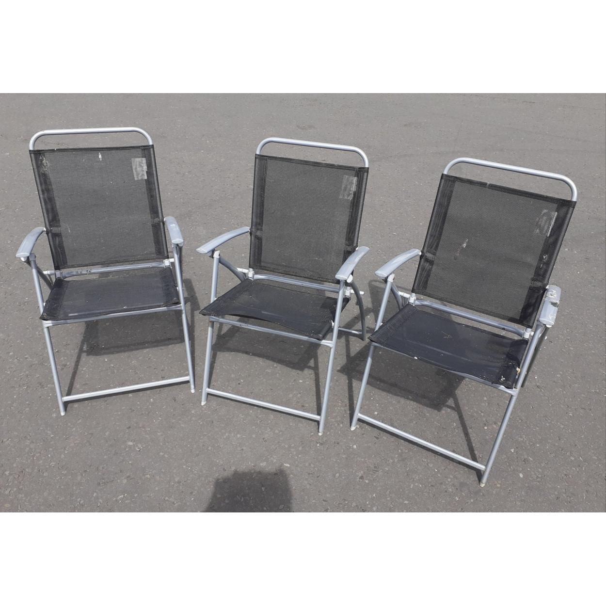 Three silver/black folding chairs ready for sunny days to come