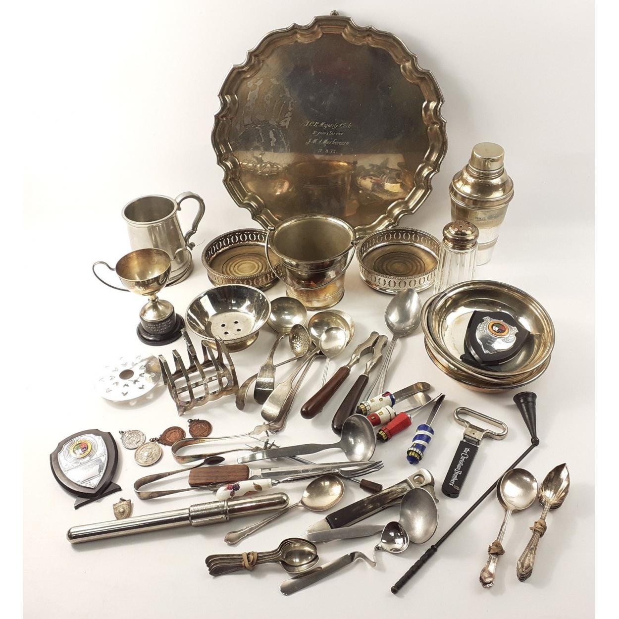 A mixed lot of silver plated items to include a large 36cm approx salver with a 1973 inscription. Also incudes cocktail shaker, sifter, wine coasters, tankard and silver plated utensils.
