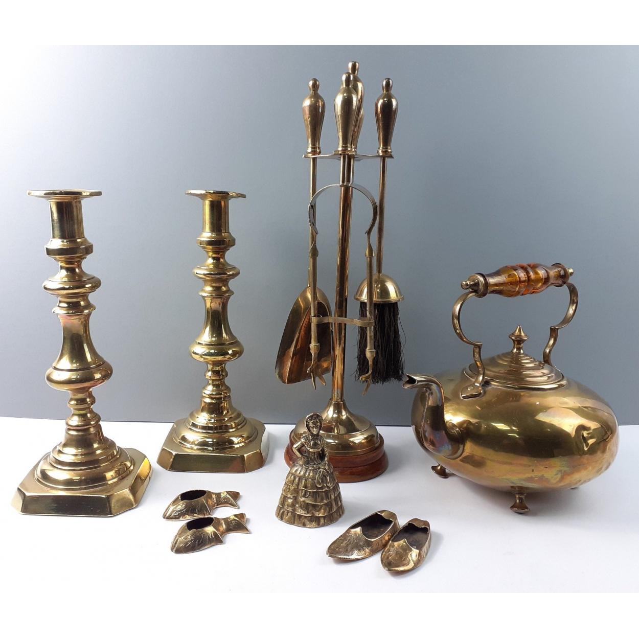 Some very nice brassware to include a 4 piece fireside companion set, a brass kettle, pair of candlesticks (28cm tall), bell etc