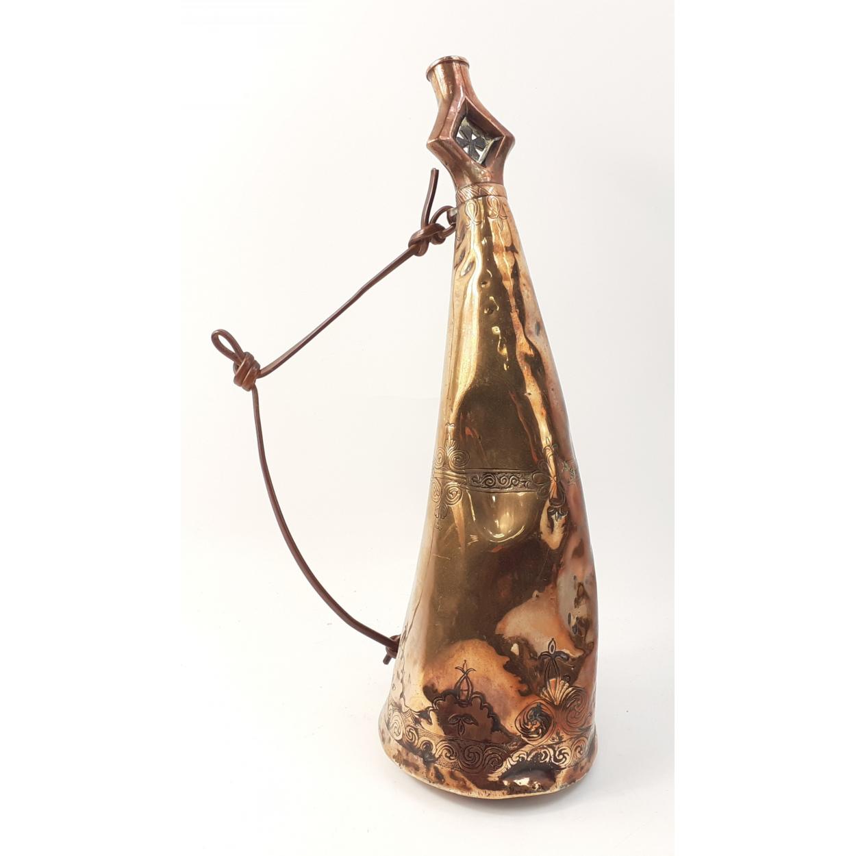 INTERESTING! A large ANTIQUE solid decorative copper drinking vessel with decoration and an unusual cross at the spout - a few dents but otherwise intact - dimensions 43cm tall approx