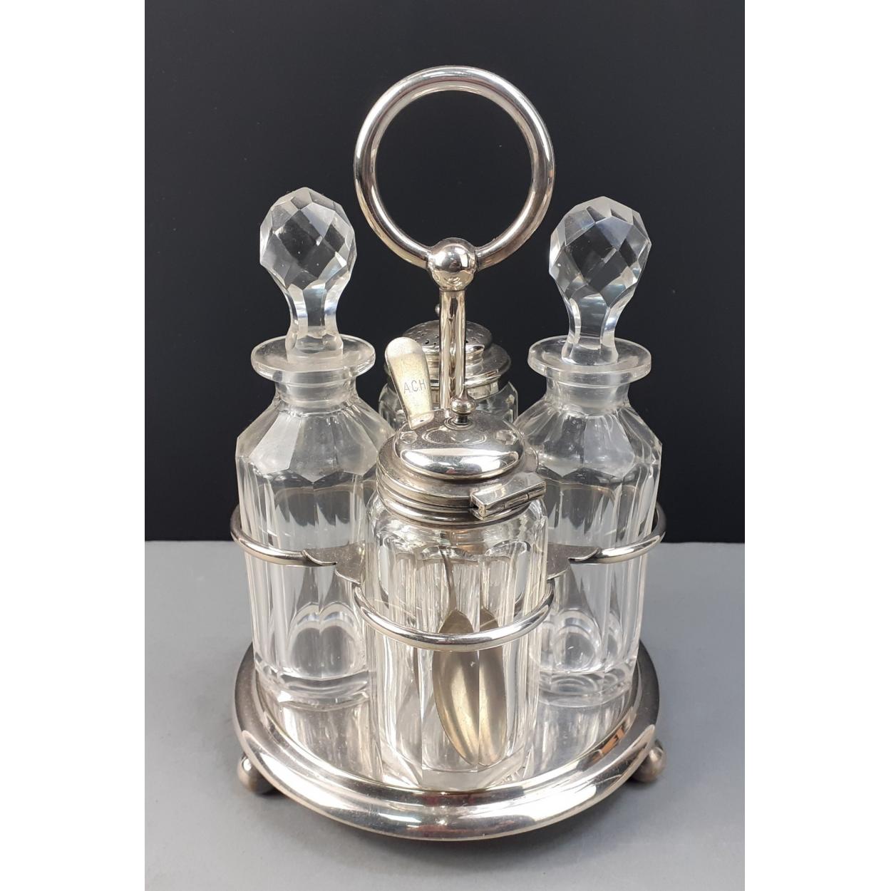 A nice VINTAGE white metal condiment set with original cut-glass bottles with stoppers - dimension 24cm tall x 14cm diameter approx