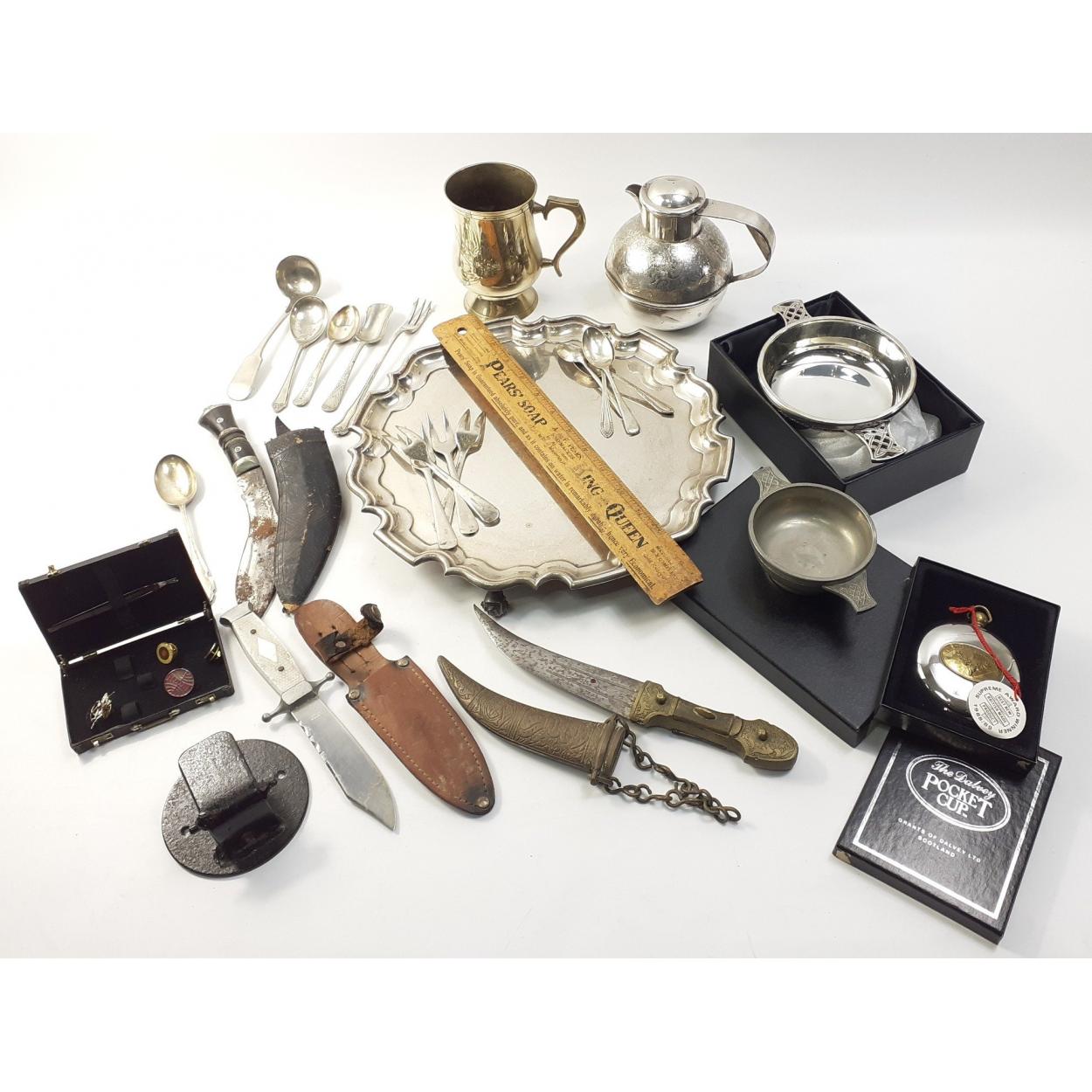 A mixed lot to include a superb WALKER & HALL silverplated scalloped edged tray (31cm dia approx), other items of metalware and silver plate, 2 nice quality pewter quaiches, various decorative modern daggers, small pin badges,
