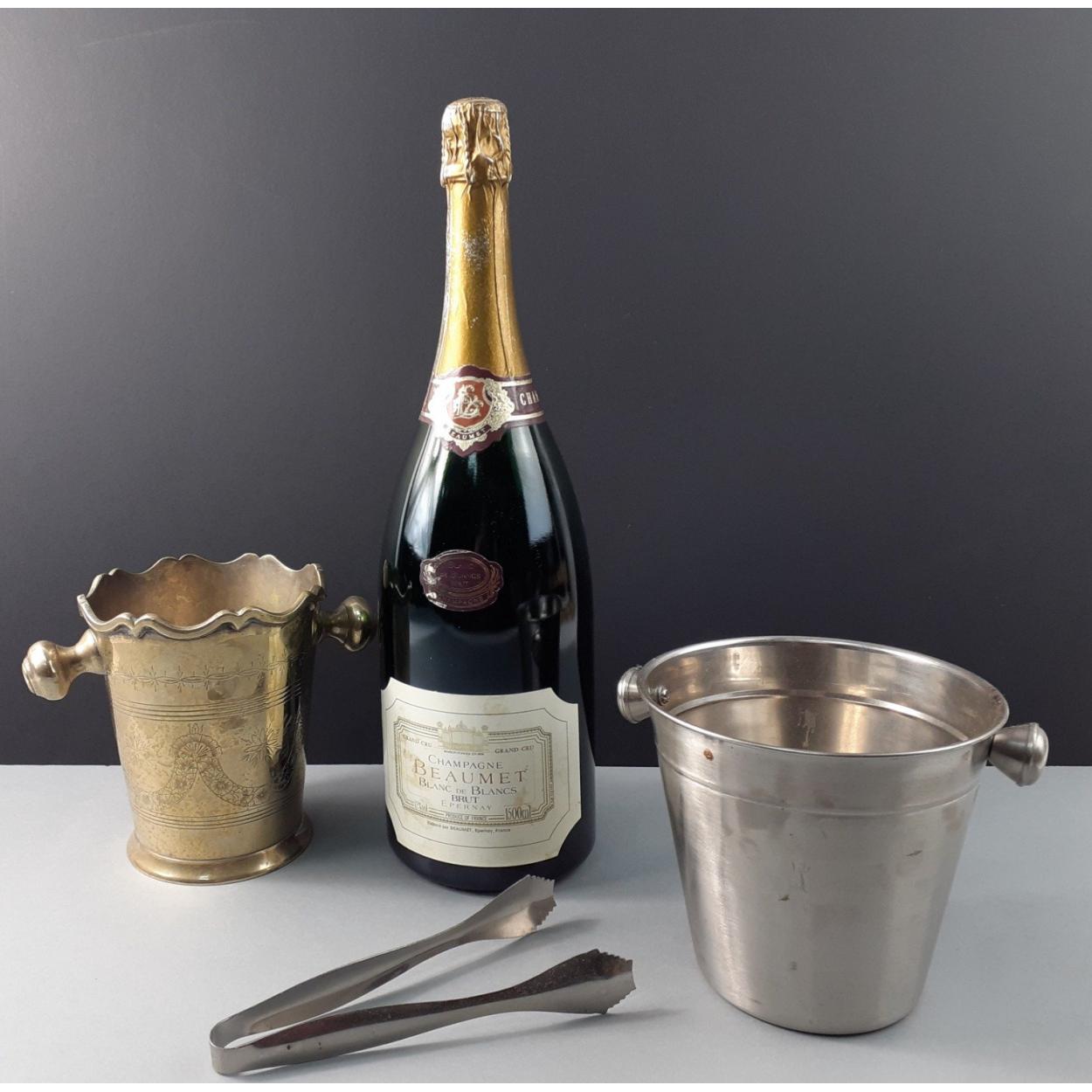 A large empty BEAUMET CHAMPAGNE blanc de blanc magnum bottle with 2 ice buckets and tongs one being silver plate