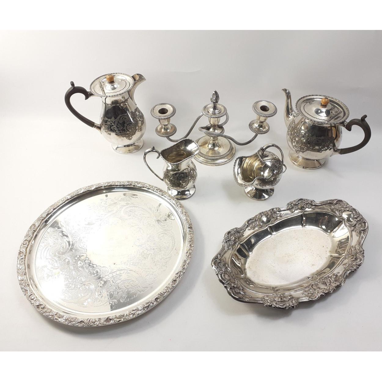 A QUALITY EP mixed lot to include an inscribed Sheffield silver plated salver 33cm long, a Yeoman plated tray, and other bright cut attractive pieces