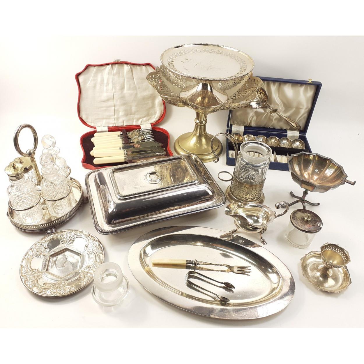 A collection of mainly EP ware to include a fish knives and forks set, a dessert set of spoons etc