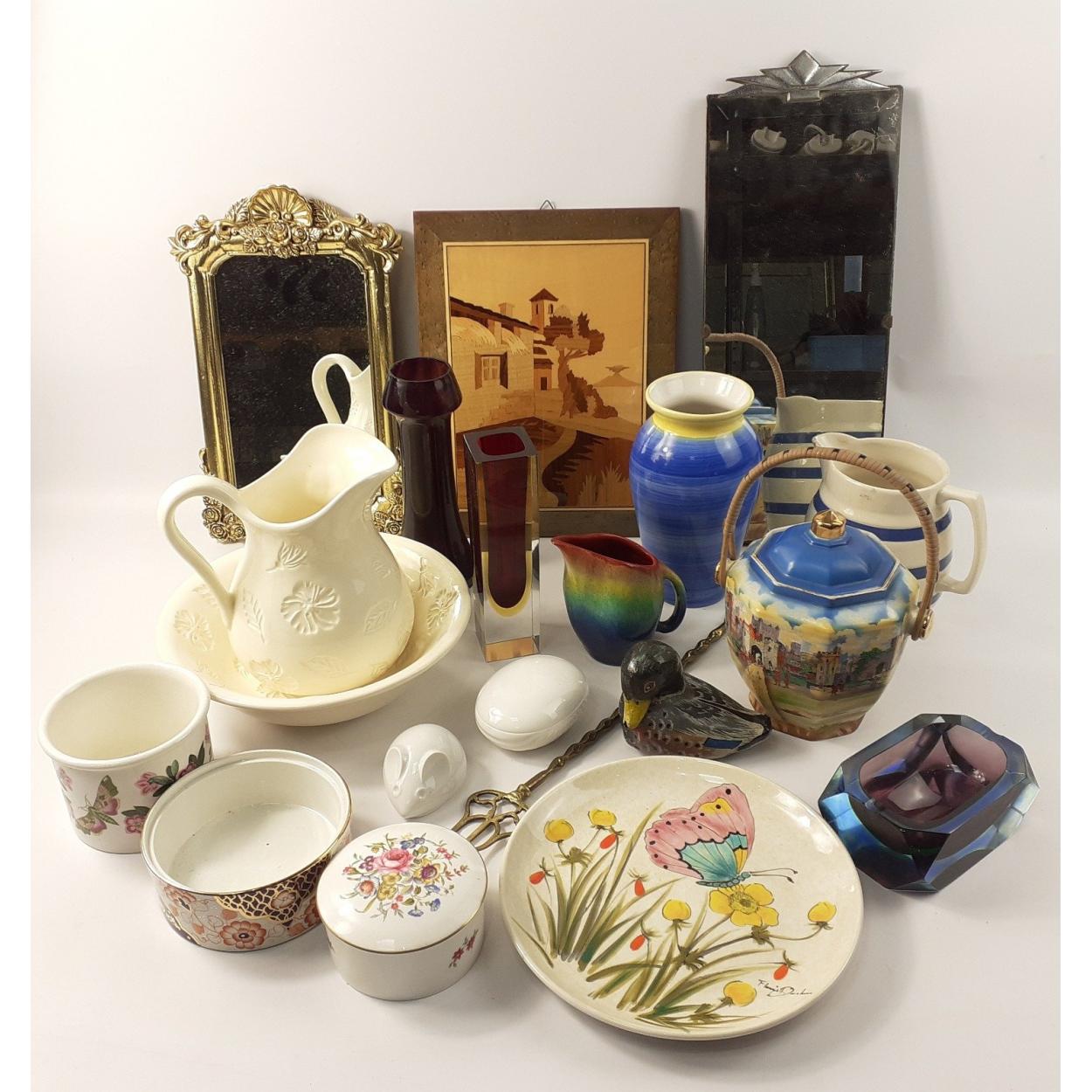 A mixed lot to include a vintage mirror, toasting fork, jug and ewer and various decorative items