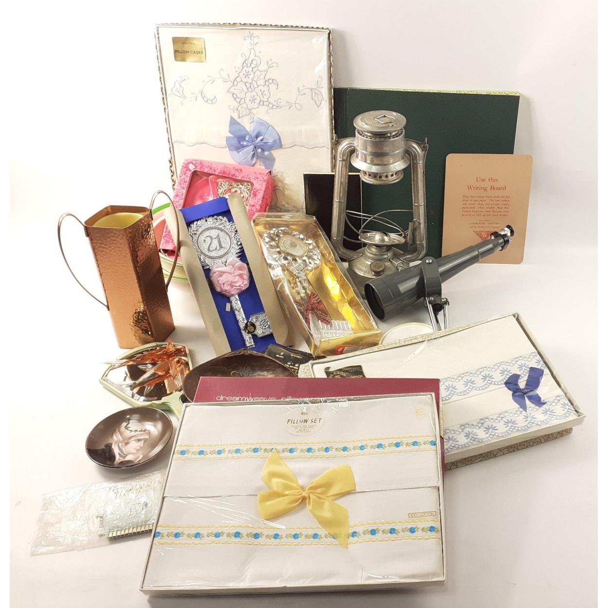 A great mixed lot to include a Czech Tilly lamp without chimney, ceramic bowls, three boxed unused linen items, copper bowl, a desktop telescope and an unused ledger. Interesting lot of good quality items.