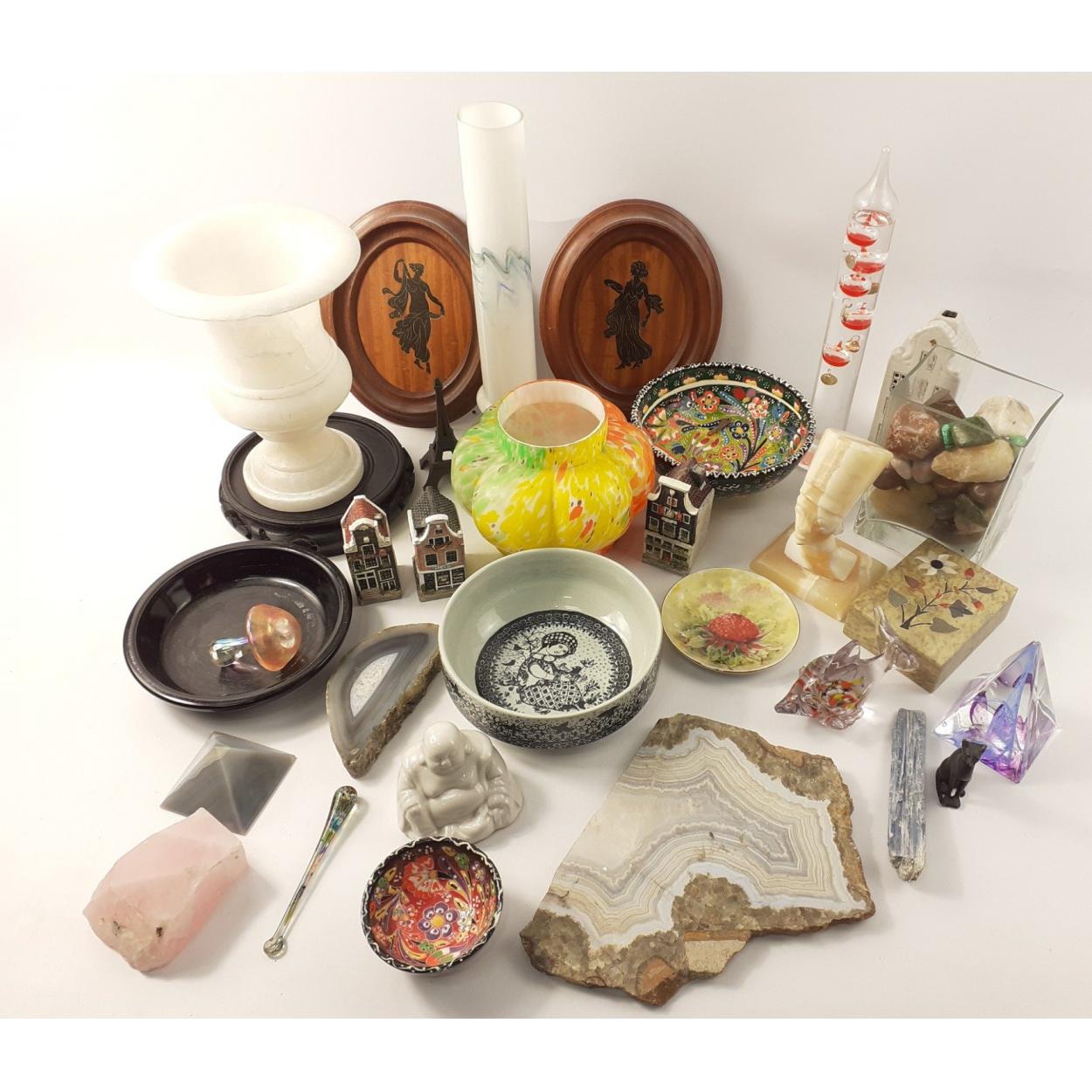 Mixed decorative lot to include various ceramic bowls, including one by Nymolle, ceramic Buddha, onyx Pharoah's head, glass thermometer, small glass mushroom, onyx urn and other decorative items.