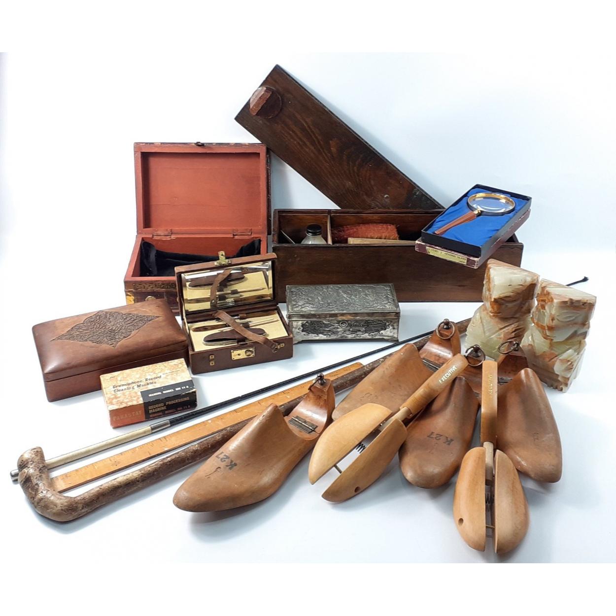 Mixed box to include a wooden shoe shine box, several vintage shoe stretchers, 2 onyx book ends, dressage crop and several other boxes