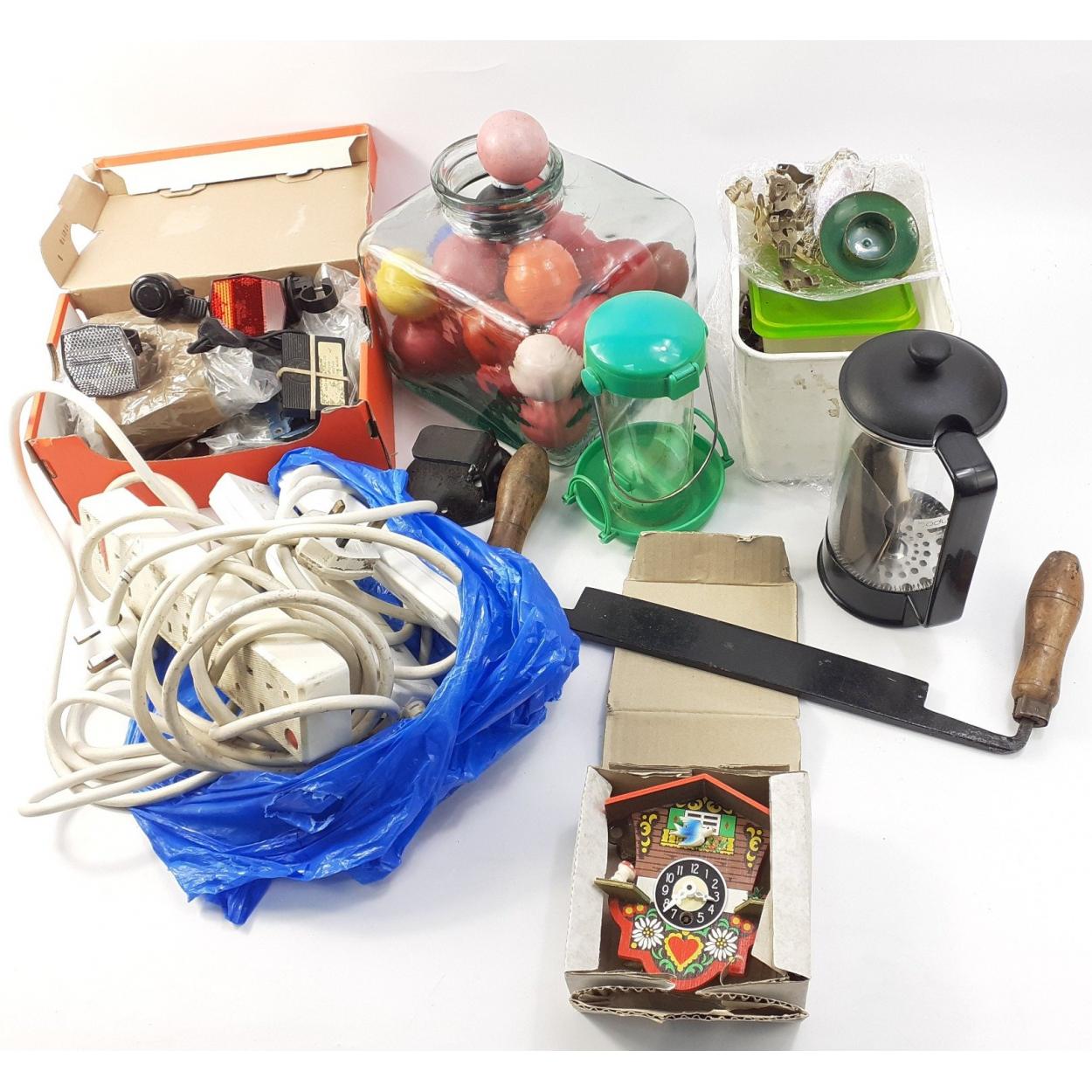 A small mixed lot to include a jar of snooker balls, a quantity of picture hooks, bird feeder, quantity of door bolts, extension cables, small cuckoo clock, cafetiere