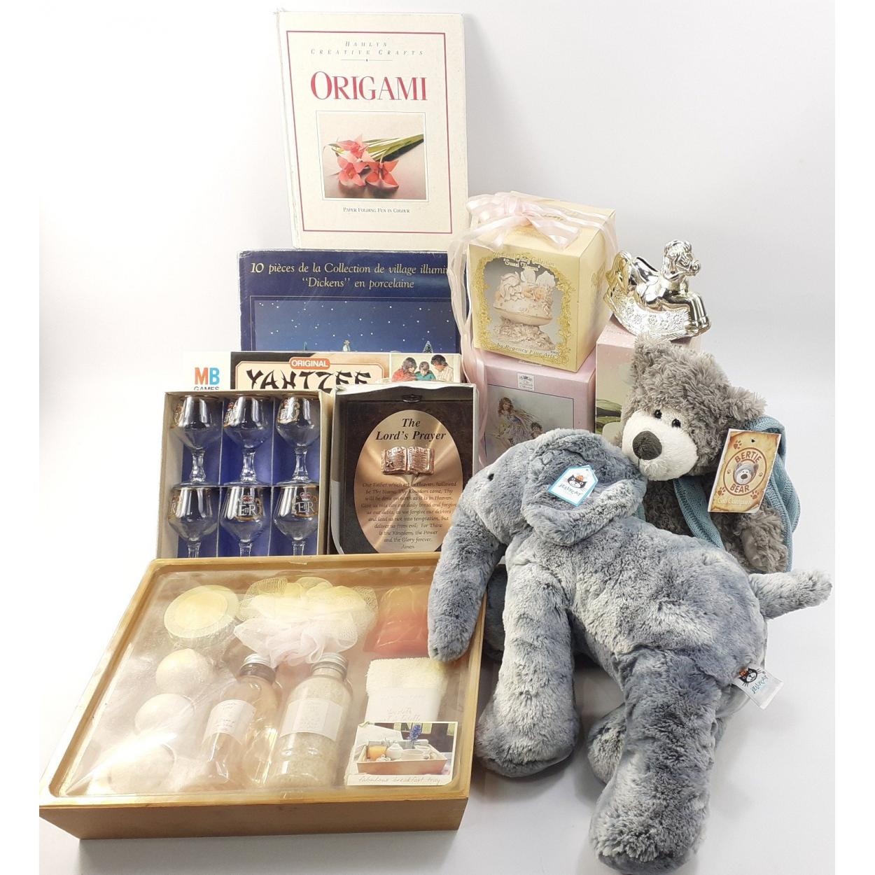 A mixed box to include a Yantzee game, Christmas decoration, 2 teddies, various boxed figurines, silver jubilee sherry glasses etc