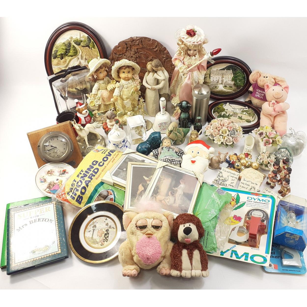 A mixed lot to include decorative items including Willow Tree Together, dolls, teddies, wall plaques and a whole lot more