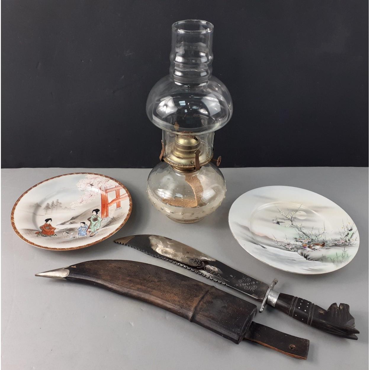 A small mixed lot to include a tabletop paraffin lamp with chimney (30cm tall), 2 x 18cm decorative Japanese plates and a decorative Indian knife in a sheath