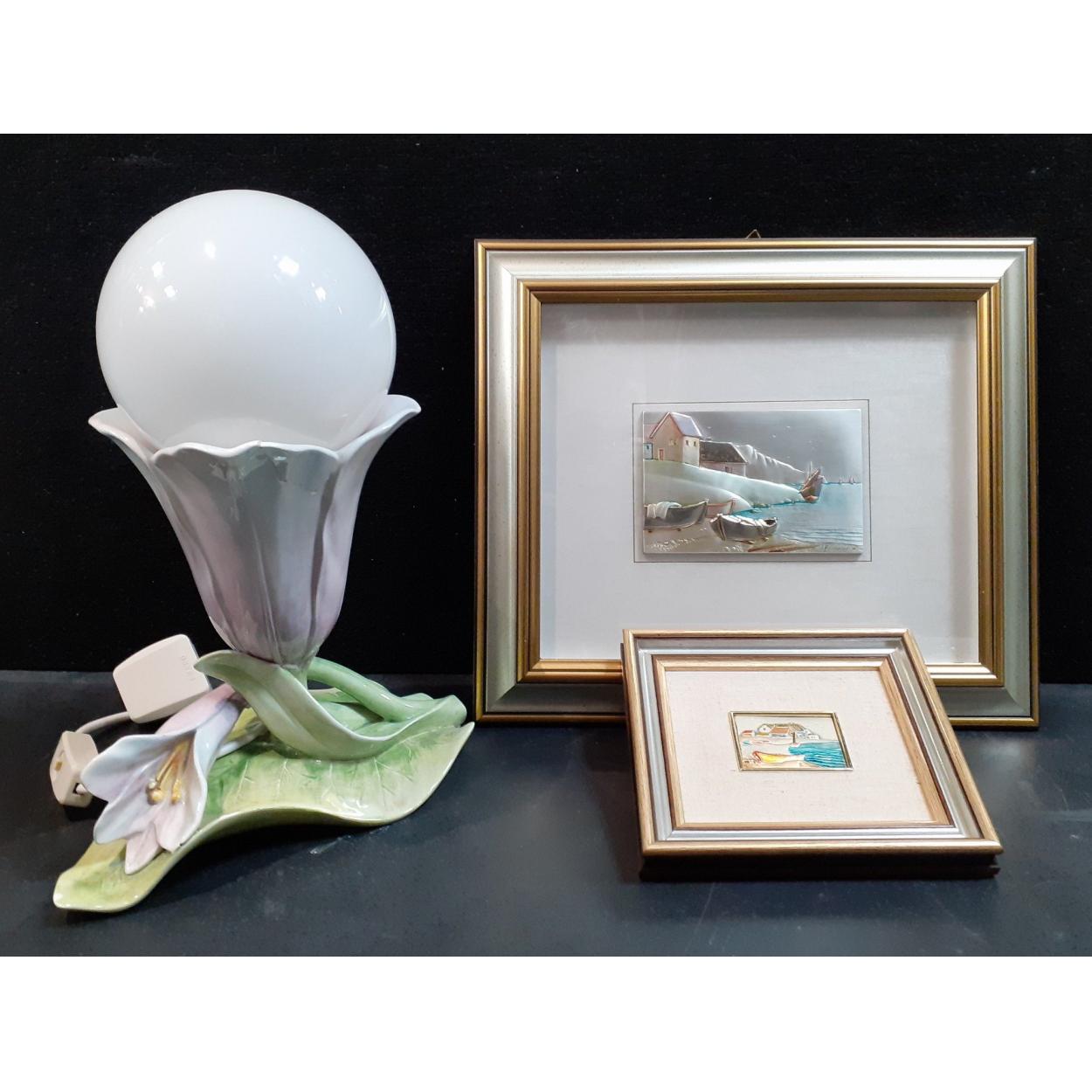 A mixed lot to include an Italian floral lamp with globe shade, stands 35cm approx, with damage and also 2 silk style prints of Oriental scene and a seaside view