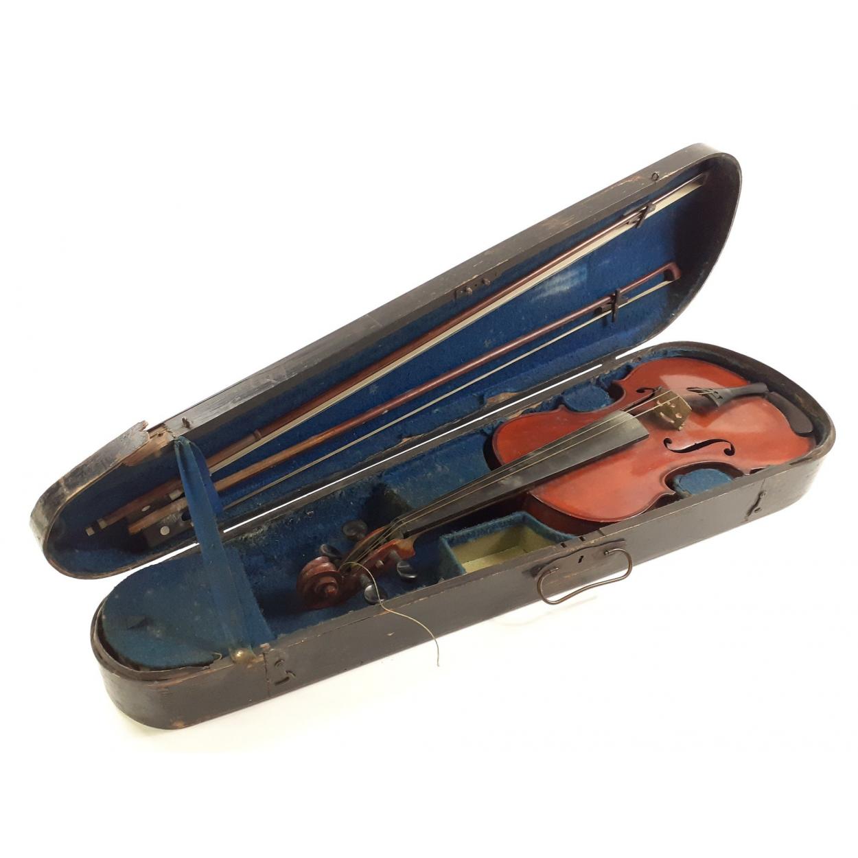 An ANTIQUE cased violin, 36cm body, with Copy of "Antonius Stradivarius made in Germany internal label". Good condition - no splits or cracks. Presented in an older case with two bows - Case does have wear. A very nice looking violin.