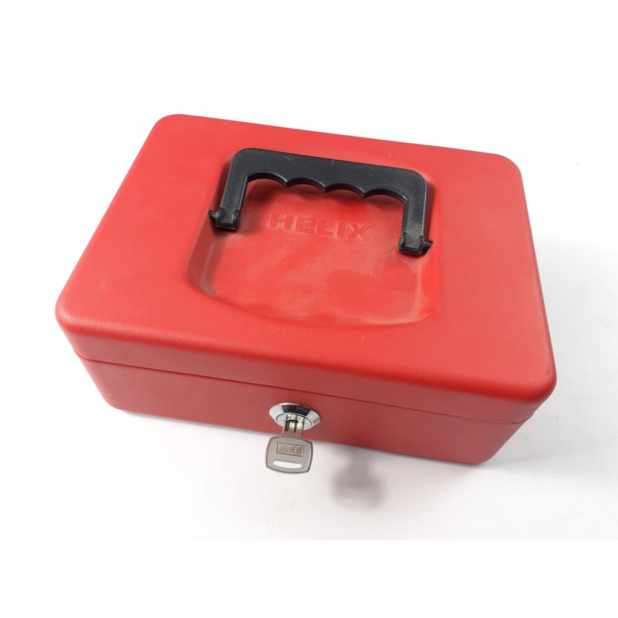 A red HELIX lockable money box with original key and interior tray, 20x15cm approx