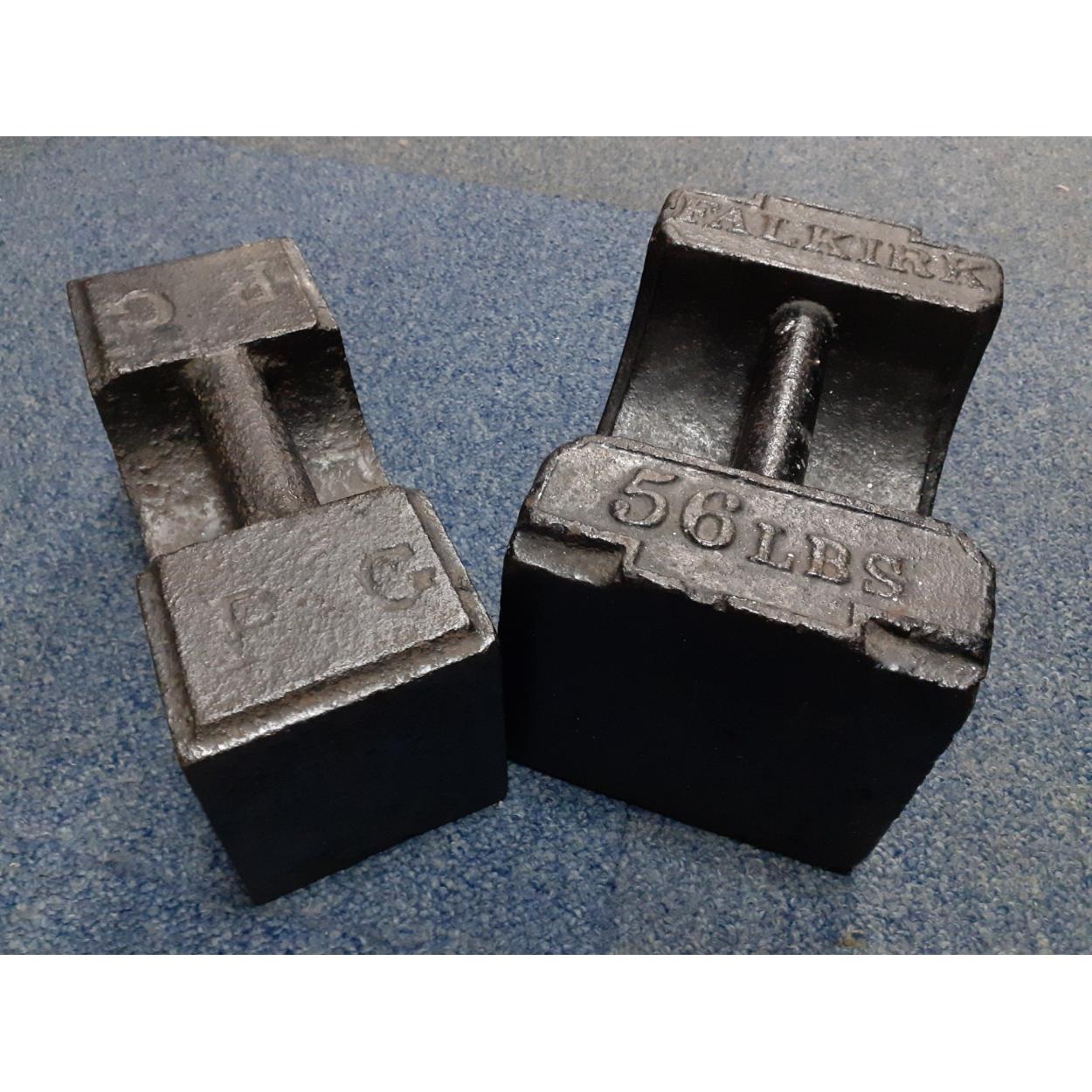 GOSH THEY ARE A FAIR WEIGHT! Two ANTIQUE large cast weights by FG and Falkirk (56lbs). Very effective door stops!