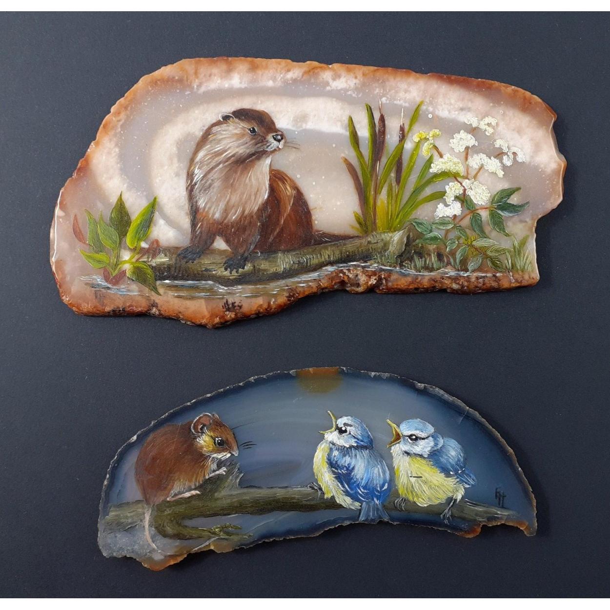 A hand painted mouse and two bluetits on Brazilian Agate - soo pretty - and a hand painted otter down by the river also on Brazilian Agate. Larger 13cm across approx