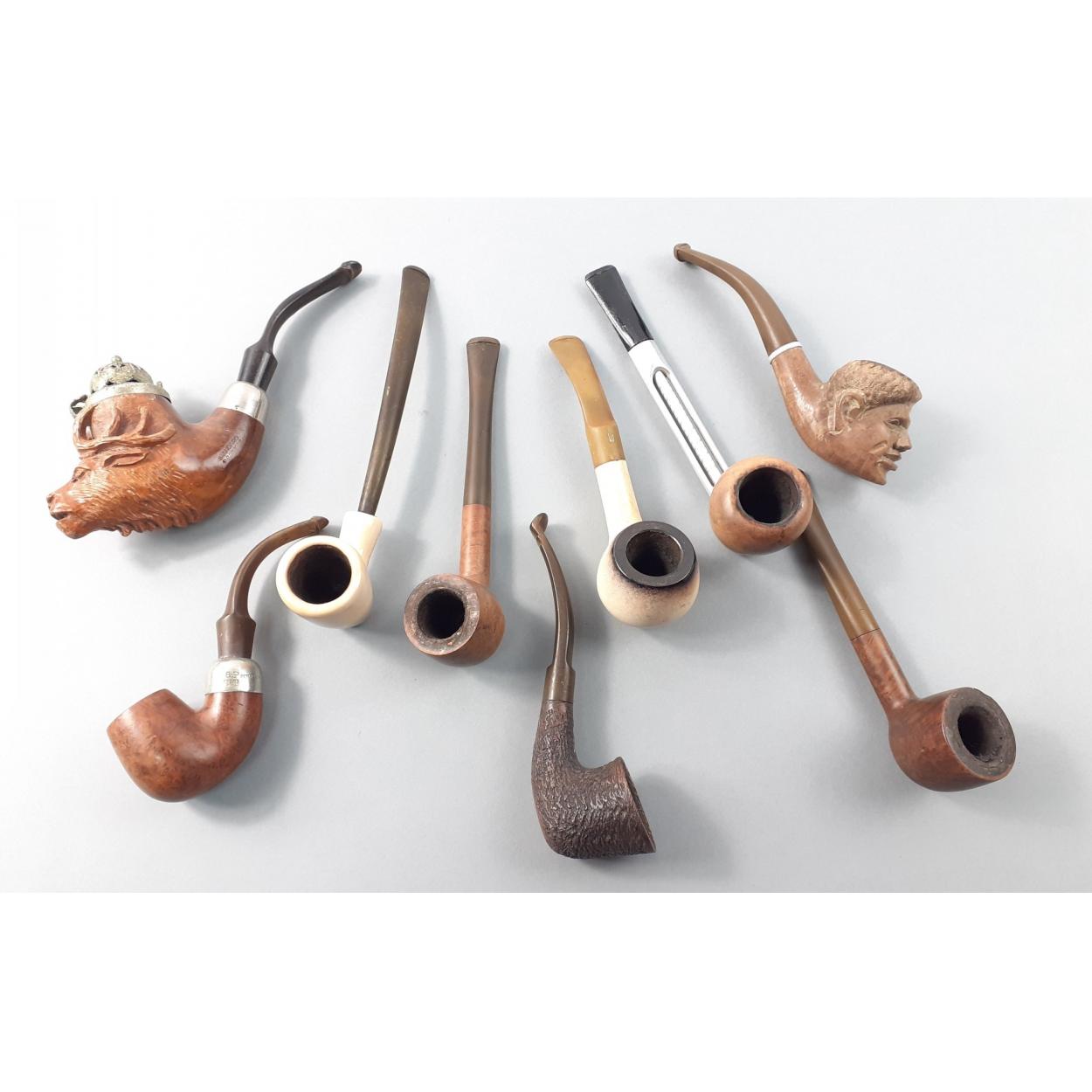 A collection of pipes including 2 clay pipes, 1 Old Bruyere, a French briar pipe, a silver hallmarked Peterson's pipe, and a Falcon