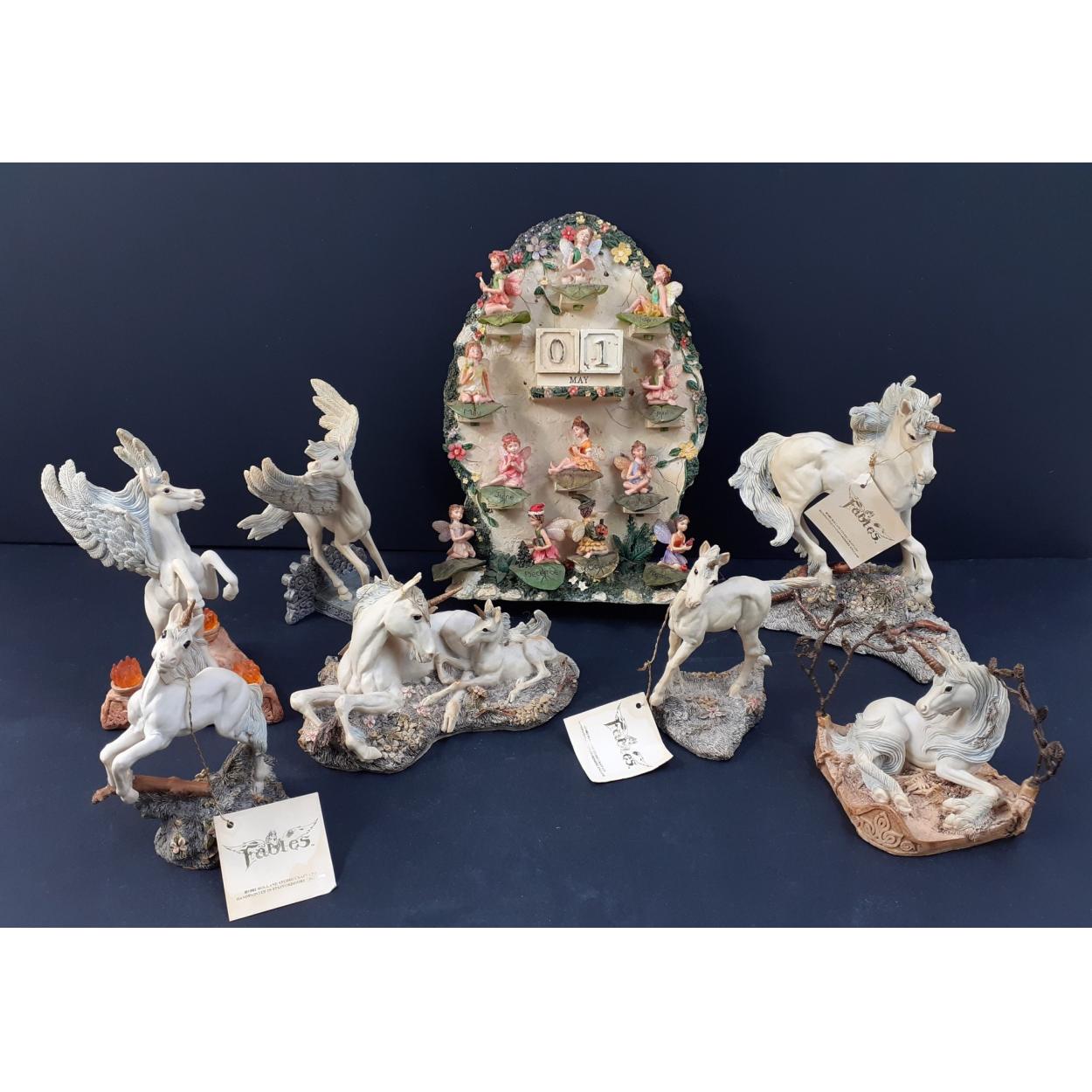 A collection of FABLES branded unicorn ornaments (7 of) tallest ornament 16cm approx and also a larger fairy collections ornament 26cm height approx