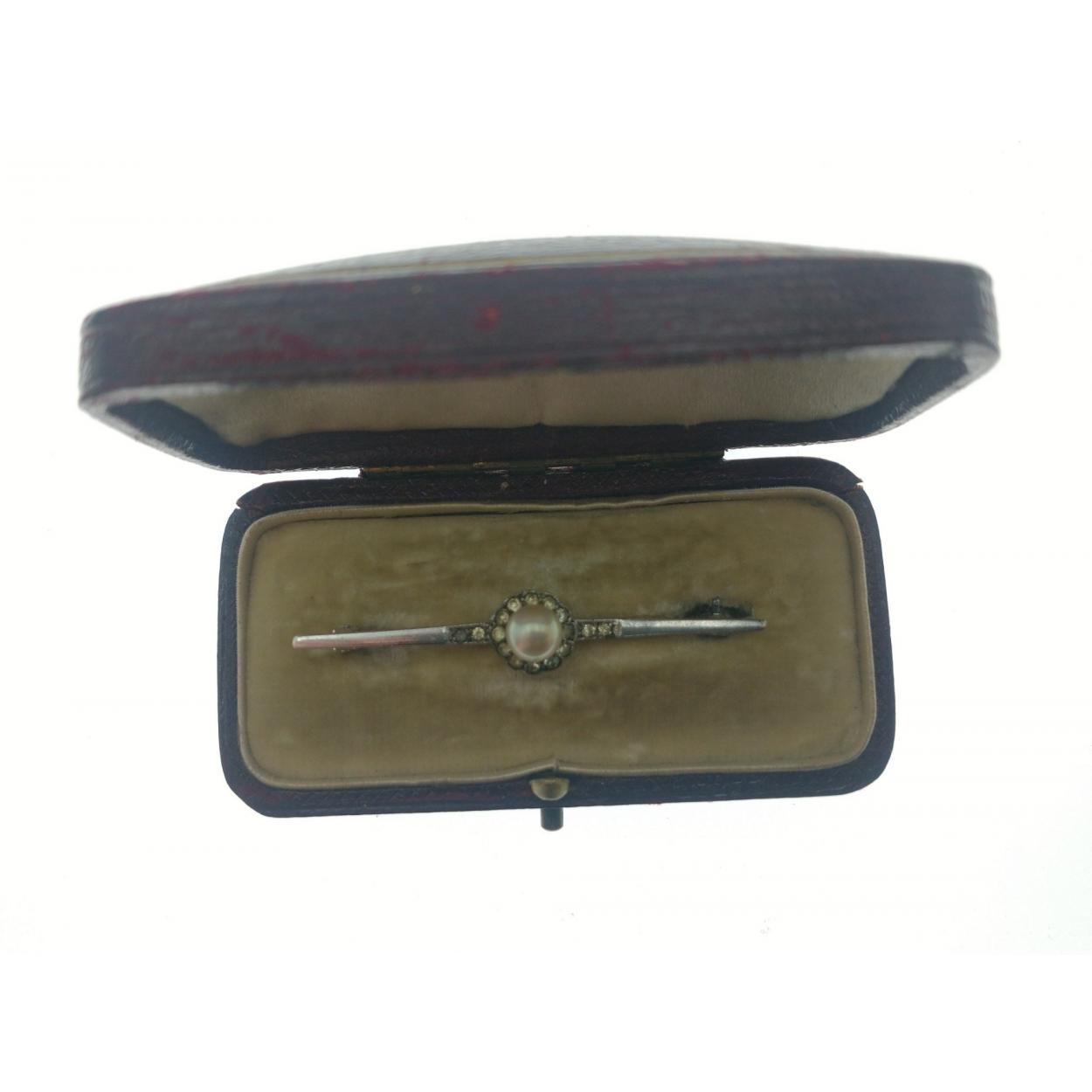 A silver bar brooch, stamped sterling set with a pearl and surrounded by clear stones, 5 cm long approx, gross weight 2.9g approx