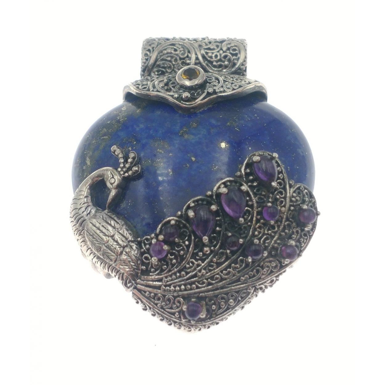 A silver pendant stamped 925 TGGC with a silver peacock with purple stones in his tail encapsulating a large blue stone 5cm length approx
