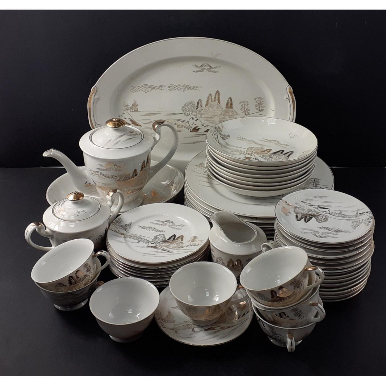 Proceeds to charity - a KATANO HAYASI fine china dinner set to include 1 large platter, 7 large plates, 8 side plates, 8 cups, 8 bowls, 9 large saucers, 7 smaller saucers, oval serving dish, teapot, cream jug (with chip to rim), sugar bowl with lid
