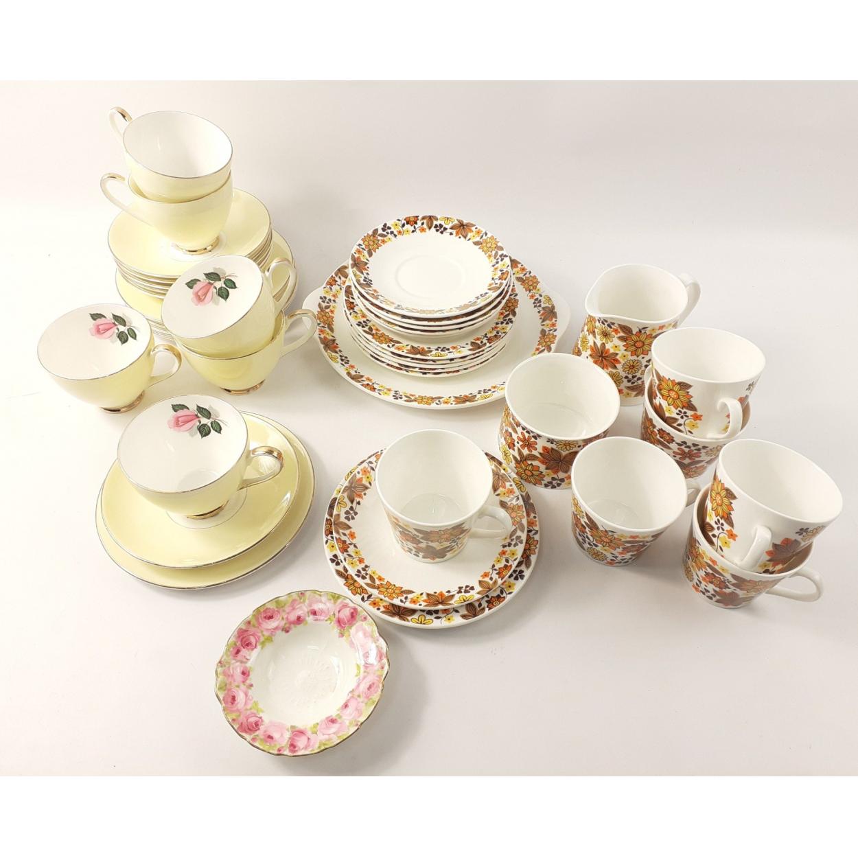 A pretty and useful lot of fine bone china to include ELIZABETHAN Carnaby pattern which includes sandwich plate, 6 side plates, 6 cups and saucers, sugar and cream and also a NEWTOWN part set of pretty rose pattern edged in 22KT gold to include 6 side plates, 6 cups and saucers. All in good condition
