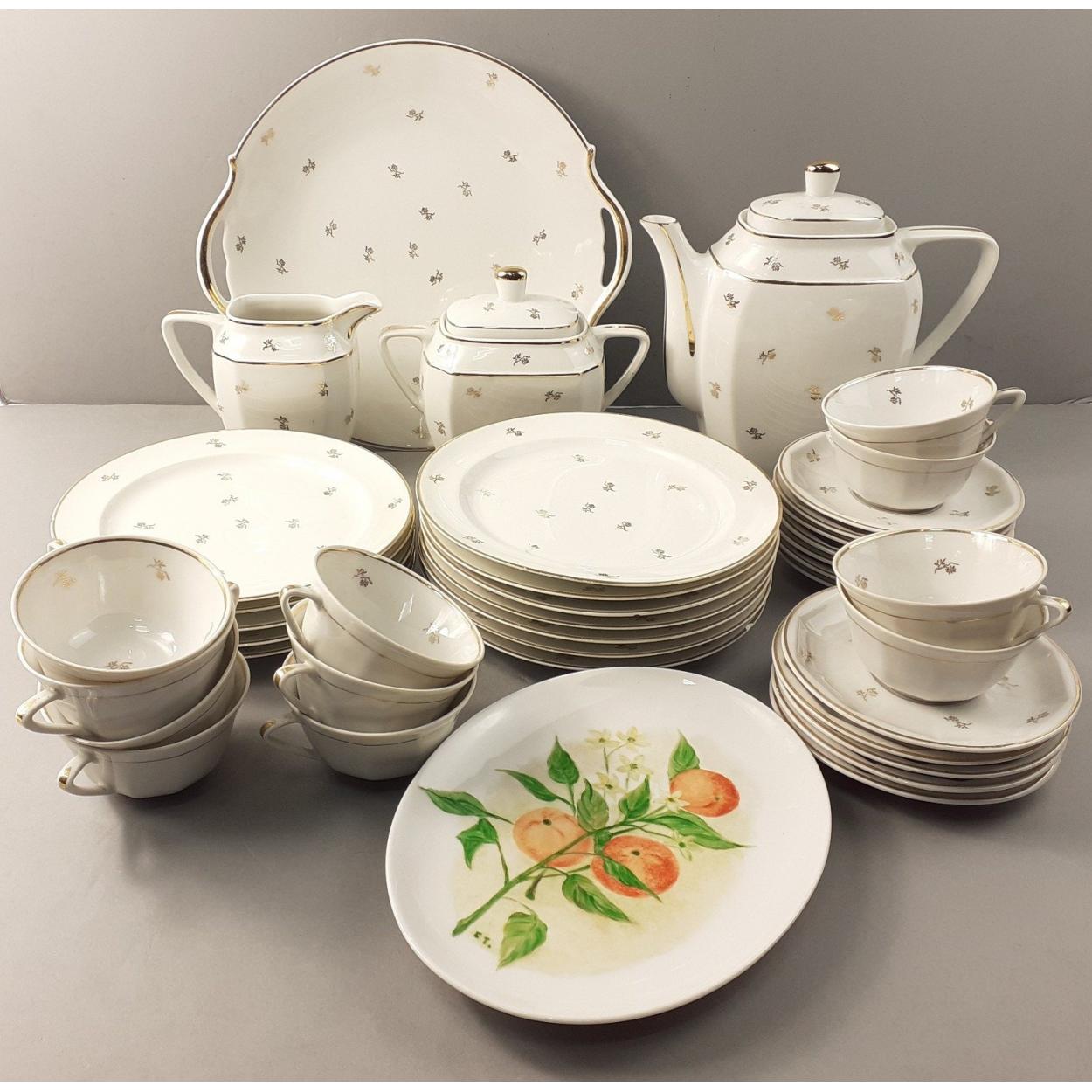 LIMOGES - A very pretty, delicate tea service in white with gilt floral decoration. A very attractive and functional set comprising tea pot (20cm), sugar bowl, cream jug (minor chip on handle), sandwich plate 29 cm approx, 12 x 20cm approx plates (4 with minor edge chips), 12 saucers and 11 cups. Came from vendor's great aunt who loved serving tea to her friends and family.