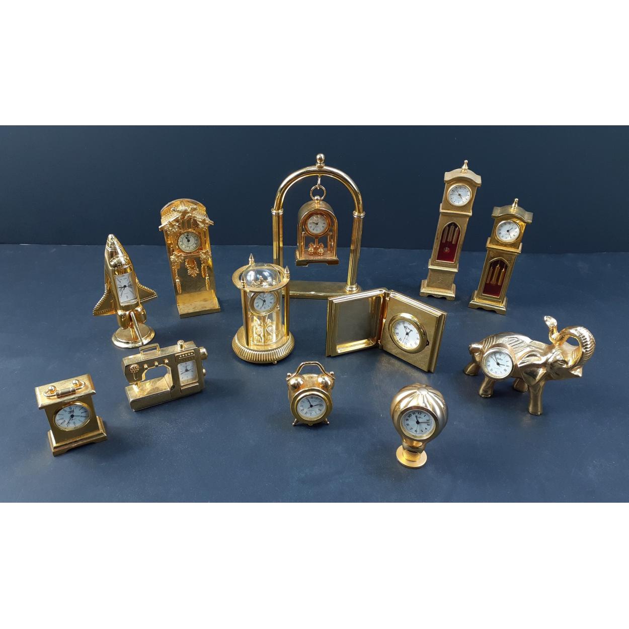 A collection of miniature clocks in yellow metal to include an elephant, grandfather clock, egg timer space shuttle etc etc - height of largest item 10cm approx