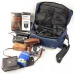A mixed lot for camera enthusiasts to include a KODAK Pronto-LK camera in case, 2 boxed VIVITAR flash units, a RICOH RW-1 camera in case, a MIRANDA camera case with a CANON CB-110 charger, a KODALUX 3 flash,