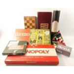 A mixed lot of games to include Monopoly, Cluedo, Extra Trivia, Eckolo, Magnetic Dart Board and Travel Scrabble.