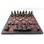 A large chess board (46x46cm approx) with stone pieces in the style of the Lewis Chessmen, missing 2 pieces
