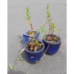 Three small blue glazed pots one with a tulip decoration (small chip) largest standing 22cm high approx - incudes all weeds!:)