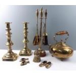Some very nice brassware to include a 4 piece fireside companion set, a brass kettle, pair of candlesticks (28cm tall), bell etc