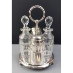 A nice VINTAGE white metal condiment set with original cut-glass bottles with stoppers - dimension 24cm tall x 14cm diameter approx