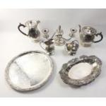 Two stainless steel trays, a silver plated tray plus teapot, water jug, sugar and cream and 2 ceramic items