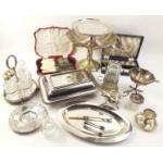 A QUALITY EP mixed lot to include an inscribed Sheffield silver plated salver 33cm long, a Yeoman plated tray, and other bright cut attractive pieces