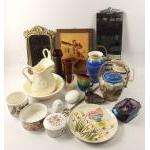 A mixed lot to include a vintage mirror, toasting fork, jug and ewer and various decorative items