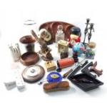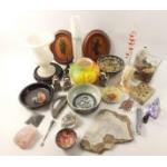 Mixed lot to include quartz clocks, a very pretty quartz frog, vase, crystal decanter, several treen items, piggy bank, jar of marbles, wooden nut bowl, pair of candlesticks and others.
